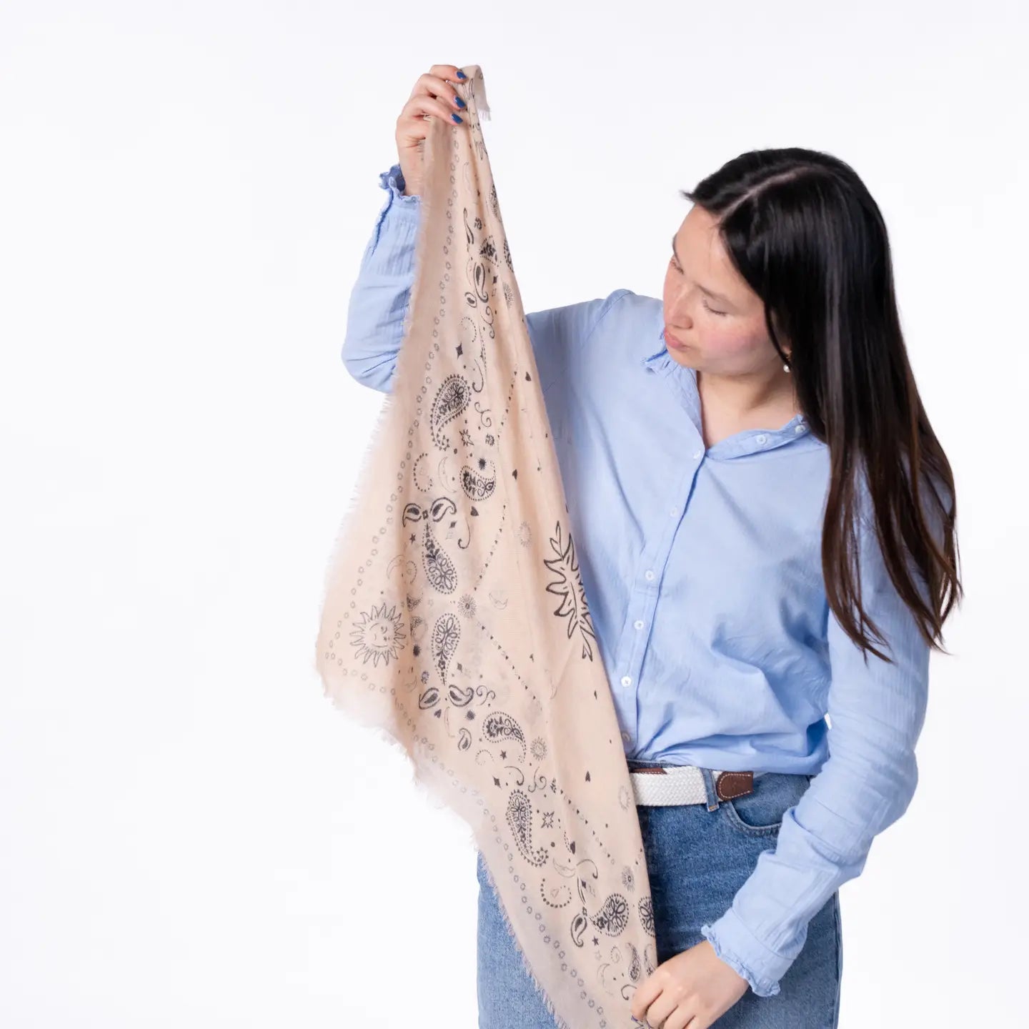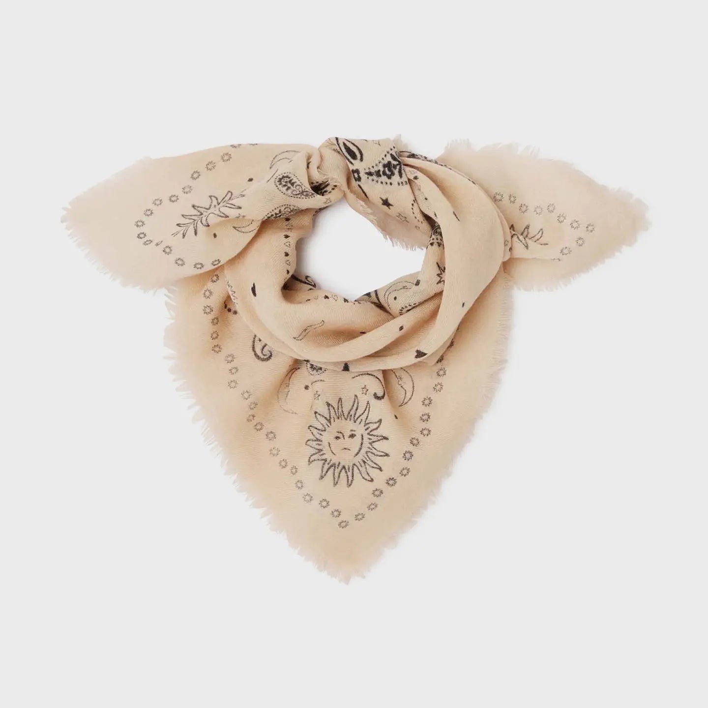 Damen-Wollschal OEKO-TEX zertifiziert, ohne gesundheitsschädliche Substanzen Dichte von 85 g/m², leicht und widerstandsfähig Astraldruck Zu jeder Jahreszeit tragbar Maße: 70 x 70 cm Farben: beige / schwarz