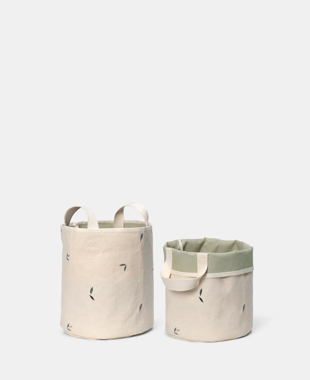 Schöner Aufbewahrungskorb mit zarten Blättern bestickt. Die Außenseite ist aus ungebleichtem Canvas, dessen Natürlichkeit sich besonders schön in den winzigen Noppen im Gewebe zeigt, die von Resten der Baumwollpflanze stammen. Ungebleichter Stoff erspart der Natur eine Menge unnötiger Chemikalien wie Bleichmittel und Farbstoffe. Und wir finden, er könnte in seiner reinen und natürlichen Farbe nicht schöner sein. Der Korb ist wendbar mit einer bestickten Seite und einer einfarbigen, staubgrünen Seite. Er fühlt sich an wie eine kräftige Papiertüte und lässt sich umklappen, um ihre Höhe und ihren Ausdruck zu variieren.
