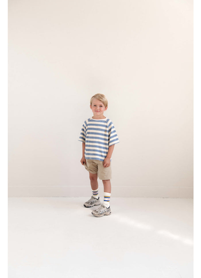 A wide fitted soft terry short sleeve tshirt - Rounded collar Wide fit short sleeves Dropped shoulder Embroidery at chest 100% Organic cotton terry