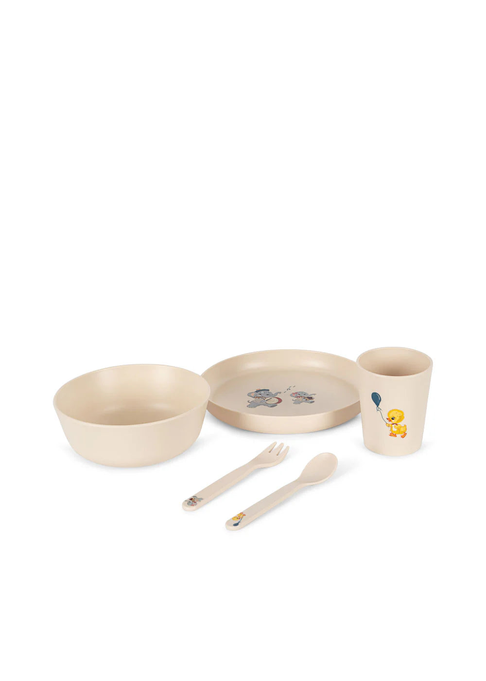 Essensset für kleine Mahlzeiten. Beinhaltet einen Teller, eine Schüssel, einen Becher und Besteck.
