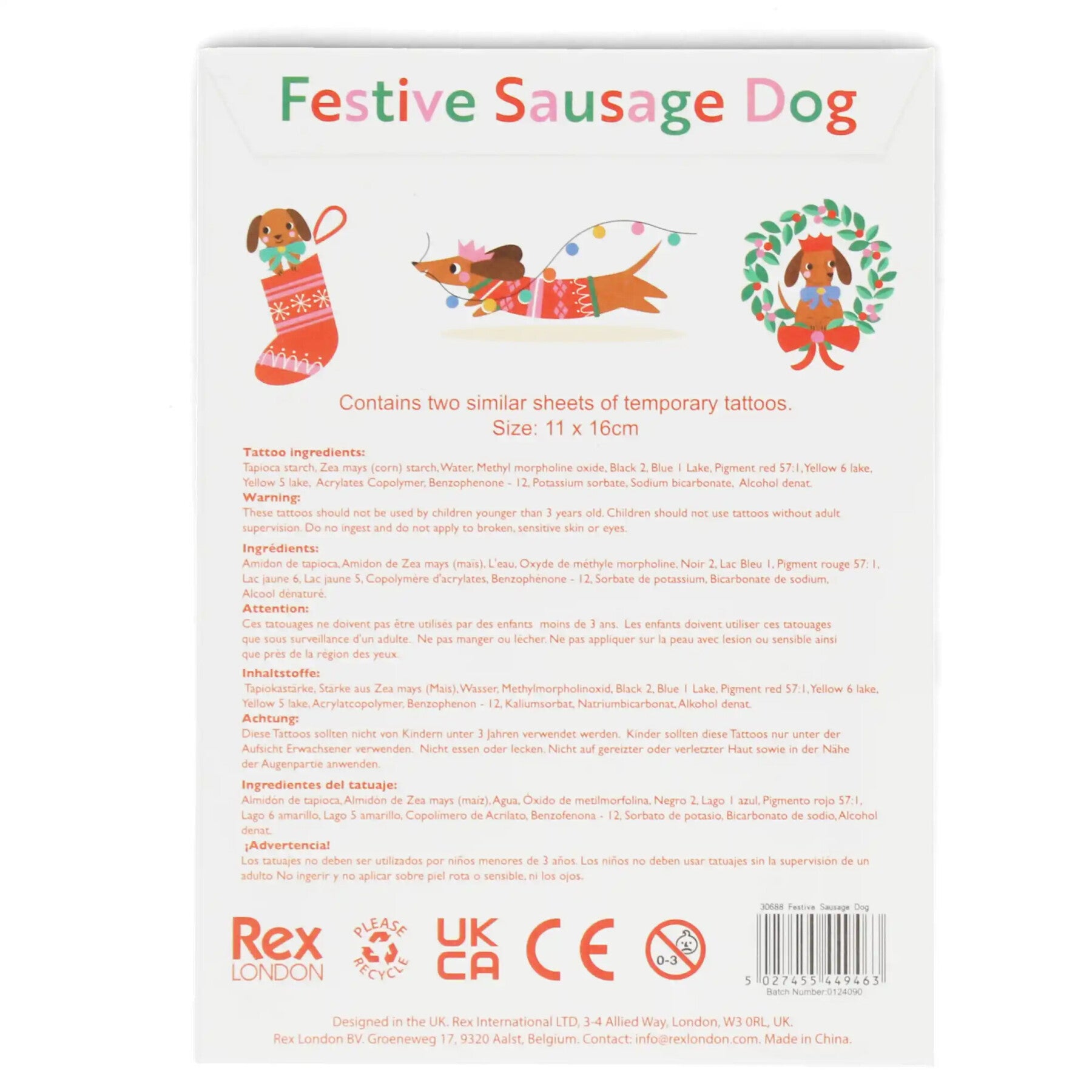 Zwei Blätter mit Temporär-Tattoos, die unseren schönen Dackel in verschiedenen Outfits und festlichen Szenen zeigen. Ideal für die Feiertage oder als Geschenk für Weihnachten und Partytüten.