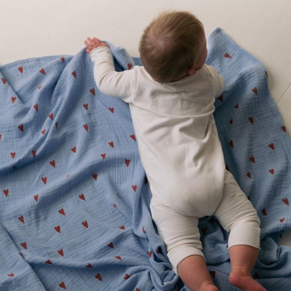 Studio Noos - große Musslintücher in Hellblau mit Herzchen in Rot in 120x120